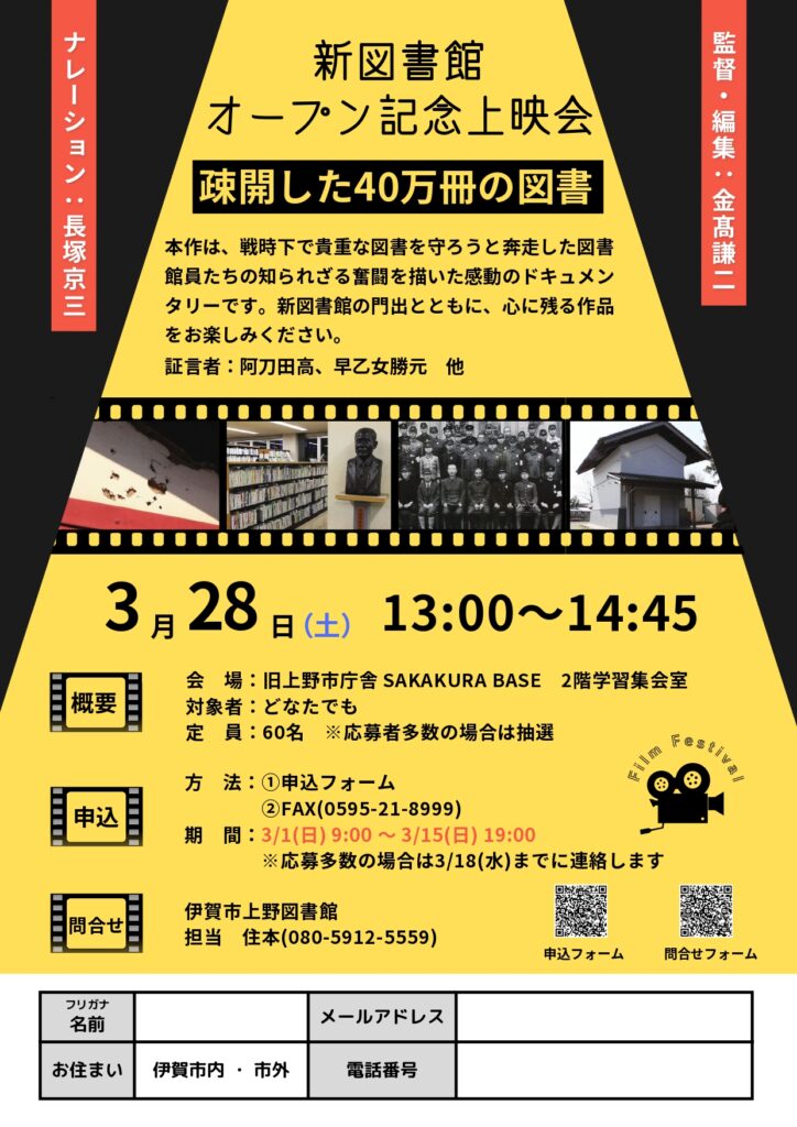 新図書館オープンを記念して、映画『疎開した40万冊の図書』を上映します。